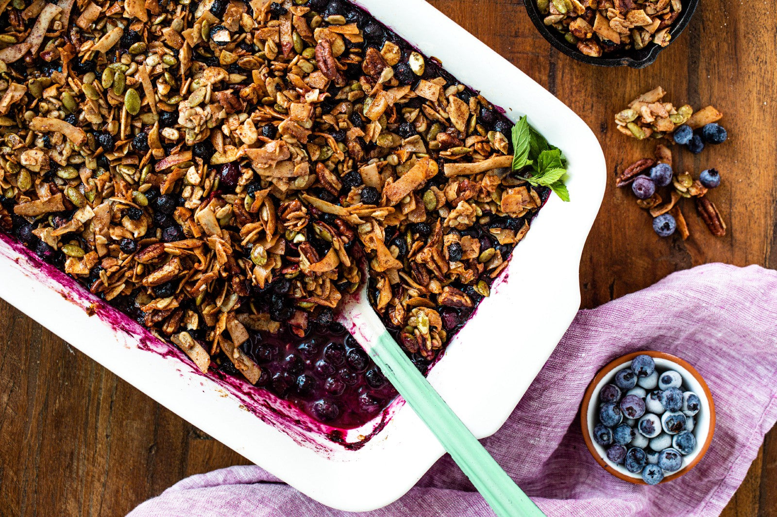 Oven-baked blueberries turn sweet, tart, and bright in a sauce of their natural sugars. A sprinkle of crunchy and nutty granola adds the perfect counterpoint to the fruit’s bright flavor.