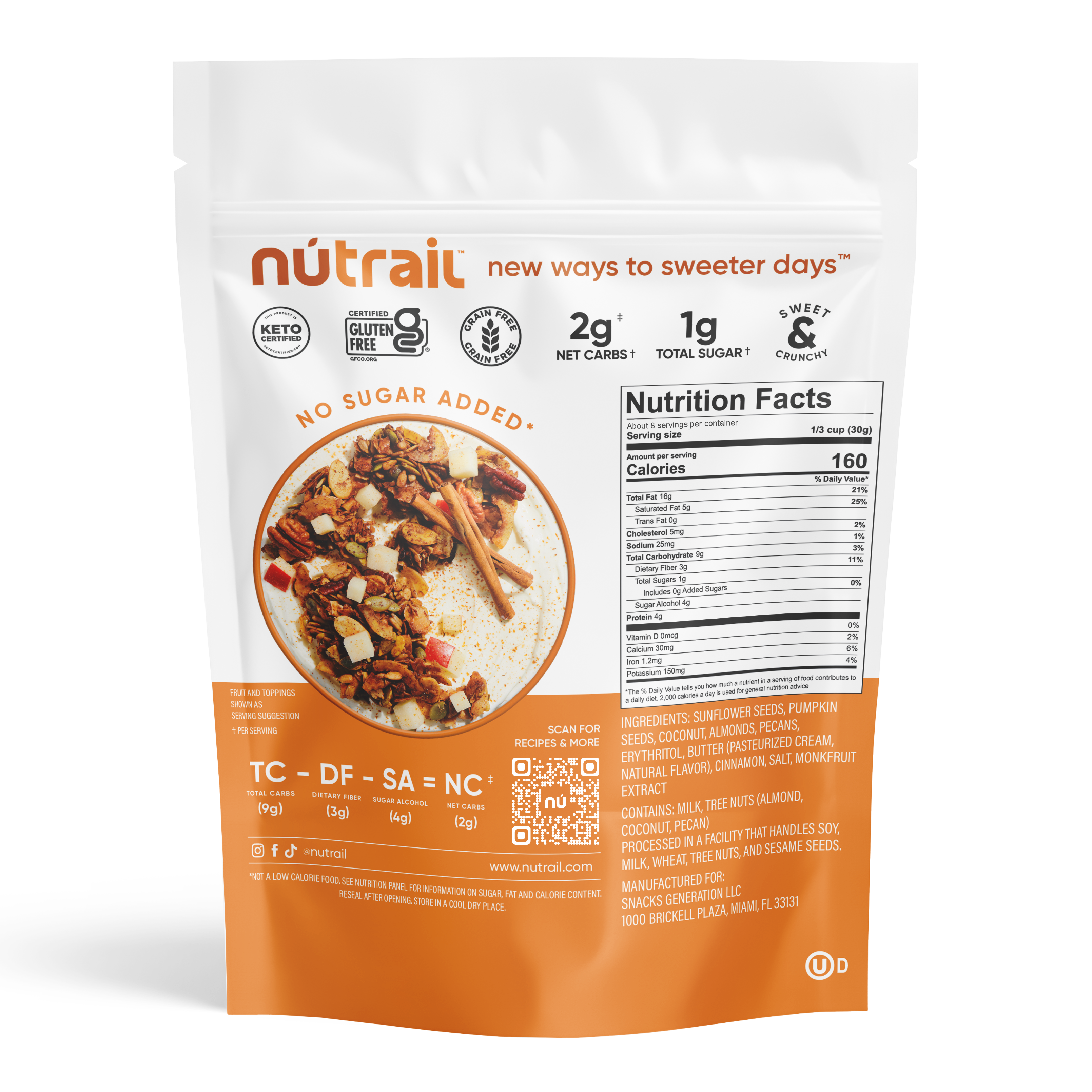 Ingredients: Sunflower Seeds, Pumpkin Seeds, Coconut, Almonds, Pecans, Erythritol, Butter (Pasteurized Cream, Natural Flavor), Dried Blueberries, Cinnamon, Salt, Monk Fruit Extract.