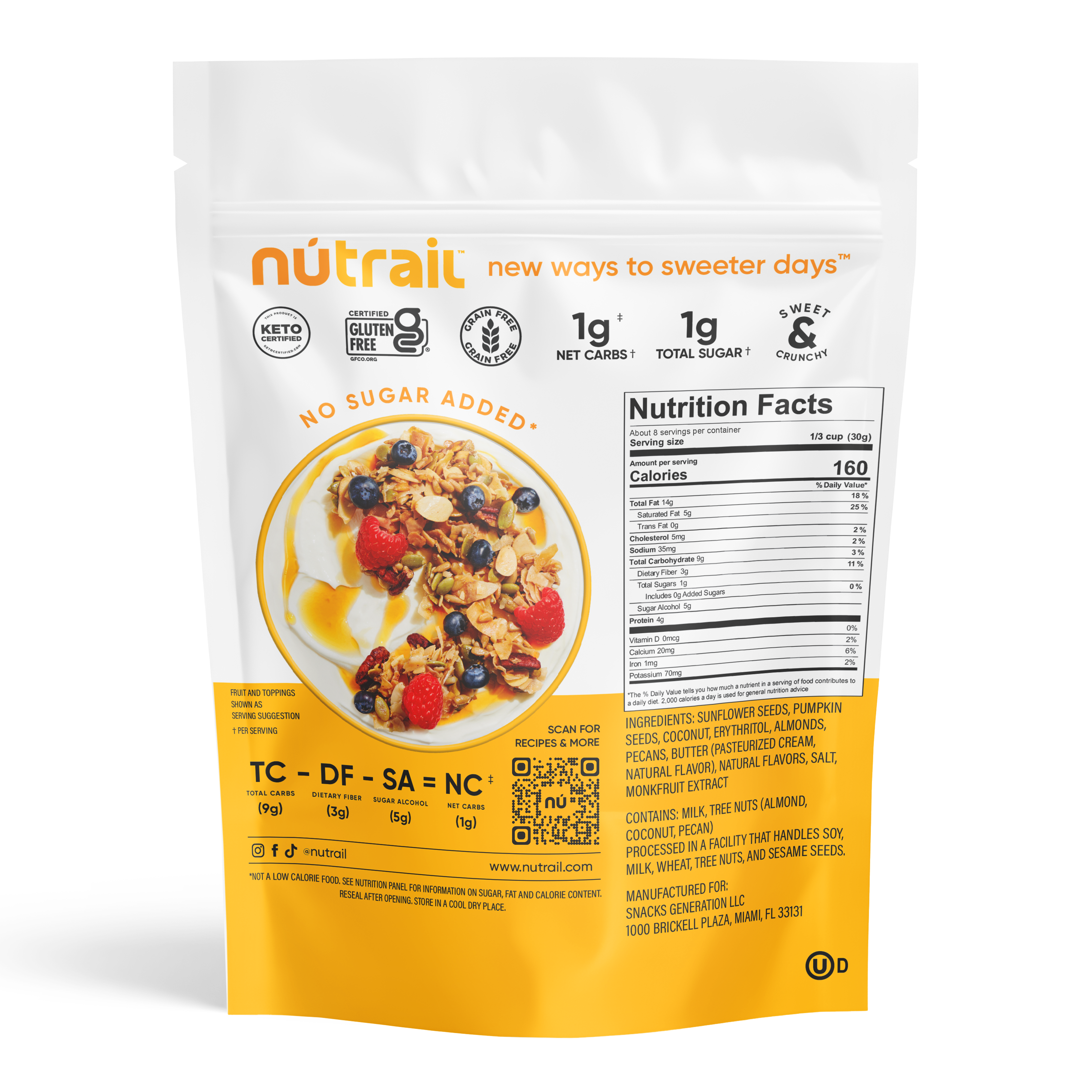 Ingredients: Sunflower Seeds, Pumpkin Seeds, Coconut, Erythritol, Almonds, Pecans, Butter (Pasteurized Cream, Natural Flavor), Salt, Monkfruit Extract.