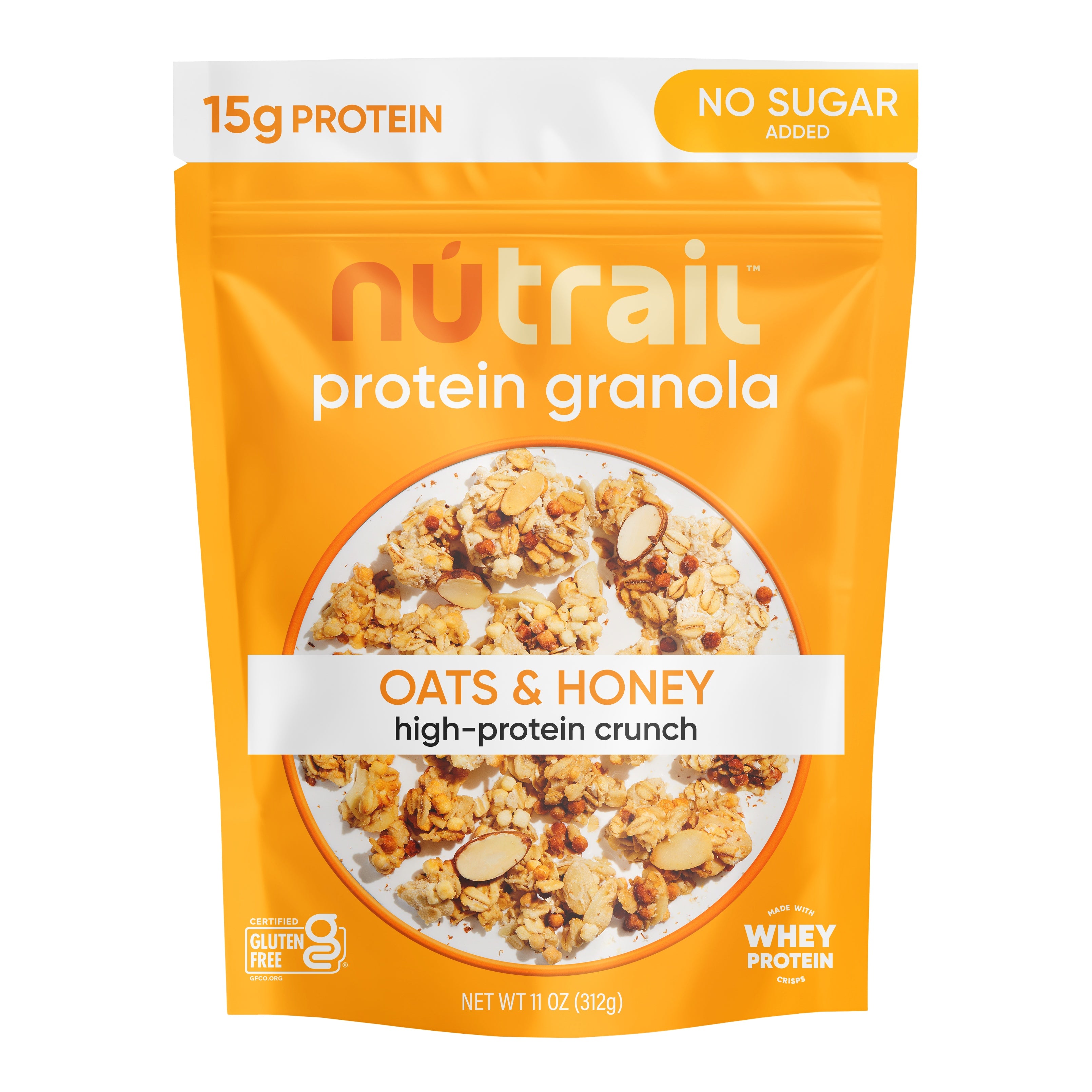 Our Honey & Oats Protein Oat Granola - No Sugar Added - takes to our Nut Granola to the next level with added essential protein crisps. Packed with 15g of protein and 1g sugar, this granola offers the invigorating flavor, crunch, and lasting energy you’re looking for. You can take this on-the-go to fuel up between meals, have it as breakfast with a bowl of your preferred milk, or use it to dress up your favorite dessert. This 8oz bag of wholesome nutrition is perfect for adventuring, relaxing, recharging, or just straight-up indulging. At NuTrail, we love meticulously crafting the best high-quality, low-sugar experiences for you. Treat yourself to a nourishing treat – you deserve it!