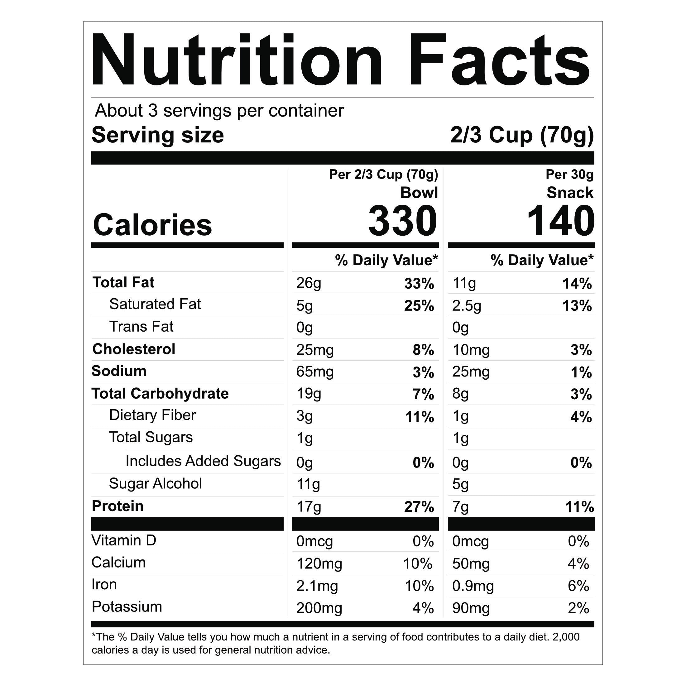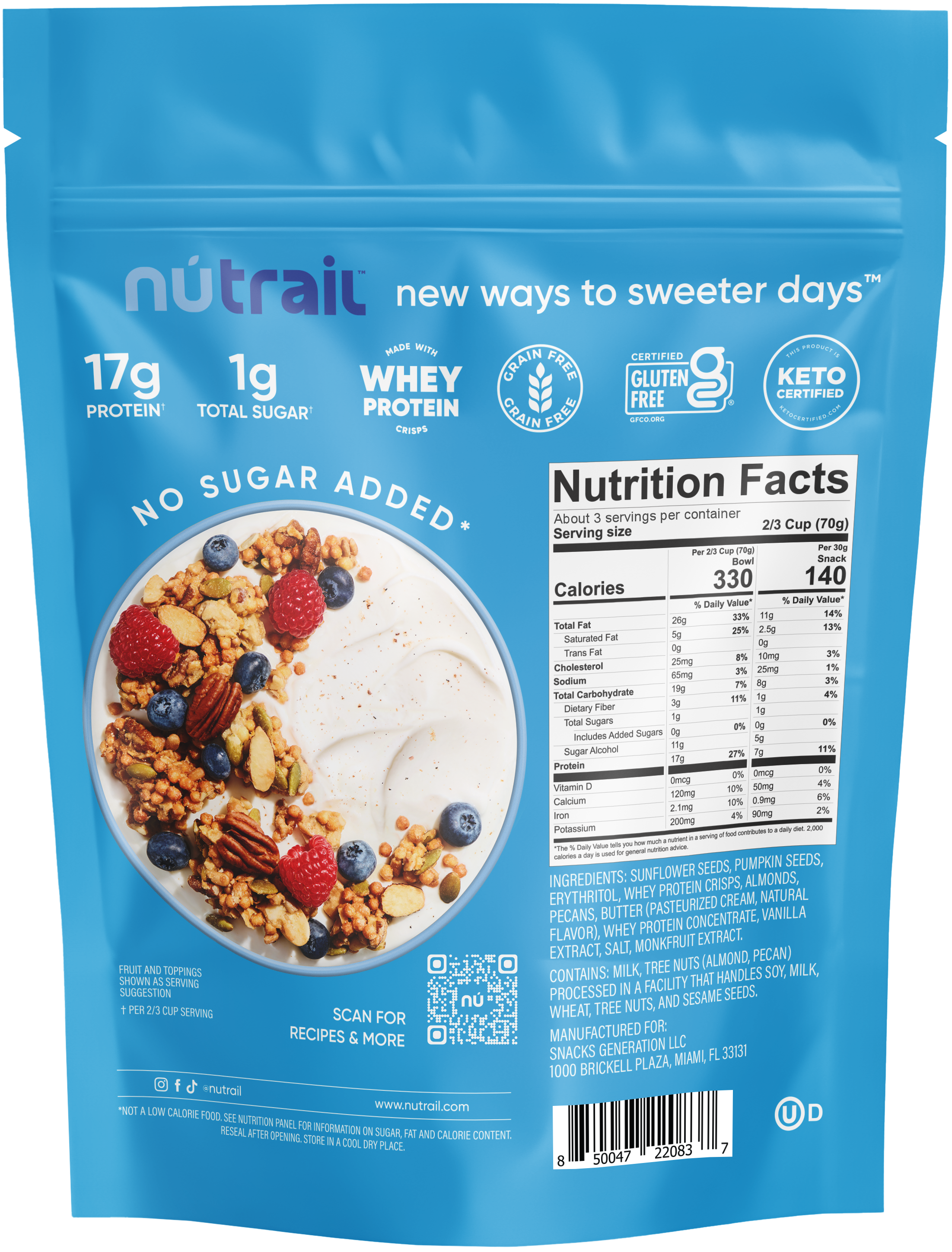 Ingredients: Sunflower seeds, Pumpkin seeds, erythritol, whey protein crisps (whey protein concentrate, tapioca starch), almonds, pecans, butter (pasturized cream, natural flavor), whey protein concentrate, natural flavors, salt, monkfruit extract