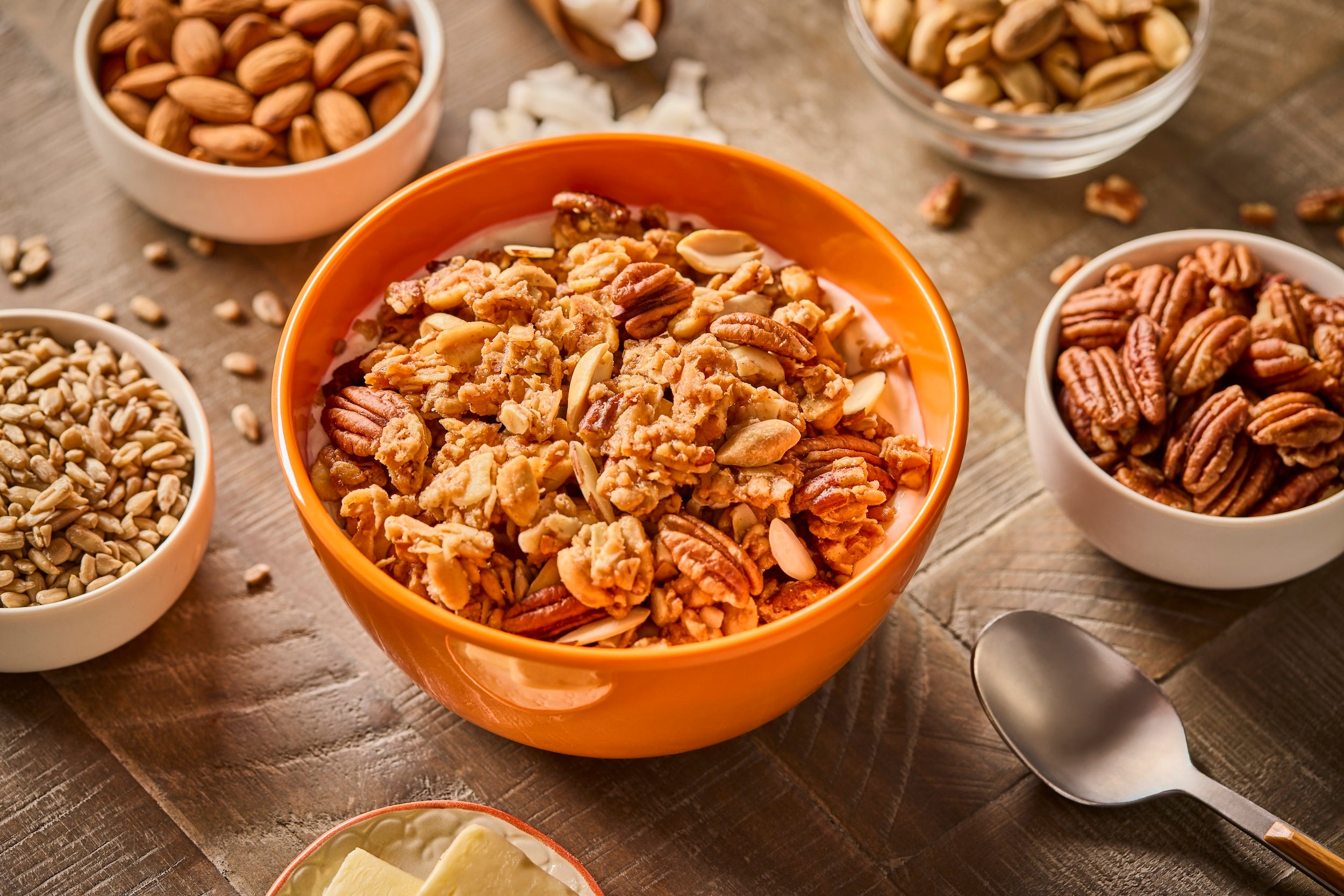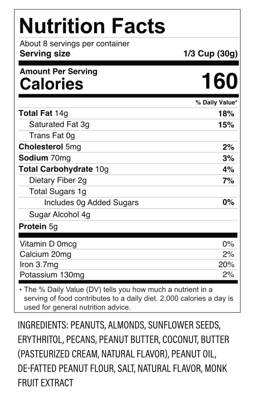 Ingredients: PEANUTS, ALMONDS, SUNFLOWER SEEDS, ERYTHRITOL, PECANS, PEANUT BUTTER, COCONUT, BUTTER, (PASTEURIZED CREAM, NATURAL FLAVOR), PEANUT OIL, DEFATTED PEANUT FLOUR, SALT< NATURAL FLAVOR, MONK FRUIT EXTRACT